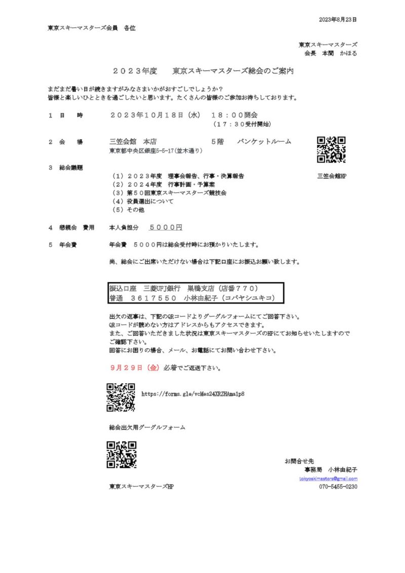 総会 東京スキーマスターズ 総会のお知らせ 総会 2023.08.312023.10.31 まだまだ暑い日が続きますが、もう8月も終わりそろそろスキーの準備を始める頃でしょうか?2023年10月18日(水)18:00より三笠会館にて総会を開催します。雪上立つ前に集まって楽しいひとときを過ごしましょう。メール、封書等でご案内いたします。ご案内をこちらにも掲載しますのでGoogleフォームで回答可能な方はこちらからご回答ください。 ご出欠のお返事お待ちしております‼️