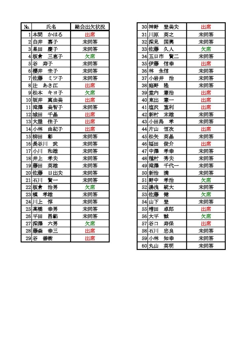 9月11日現在までにお返事を頂いております、総会の出欠状況をお知らせいたします。